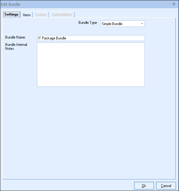 The Bundle Internal Notes are internal notes about the bundle. This could be additional insight for the sales rep before they add the bundle to the document. These are not displayed to the customer.