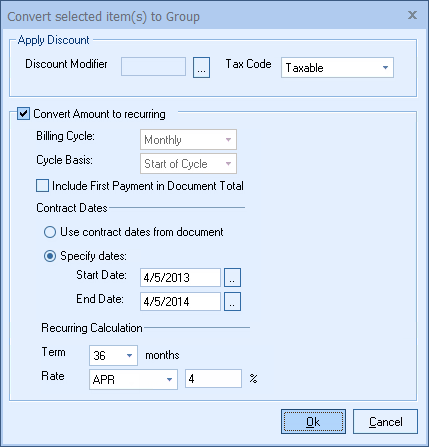 The Group Properties option enables users to set the Grouped Bundle to a single recurring monthly revenue amount (Recurring Groups). All the individual items in the bundle are totaled and an Annual Percentage Rate (APR) and a term (e.g. 12, 24, 36 months) can be set. This feature is useful for Haas quoting also.