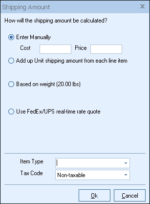 •Enter Manually: This option allows you to enter in a flat rate for shipping, and include your cost for the shipping if needed. Defaults for these can be set on the Documents Tab of the Options window.