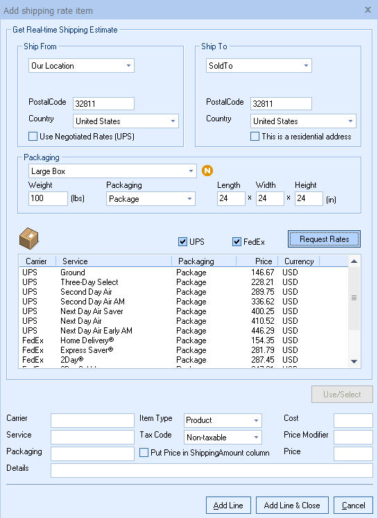2. Enter your ship from and ship to information. This can be pulled in from the current quote or entered manually. Choose your packaging, weight, the dimensions of your package, which carriers you would like to get shipping rates from, and click Request Rates. A list of the available shipping options and associated costs will be displayed for each of the carriers selected.