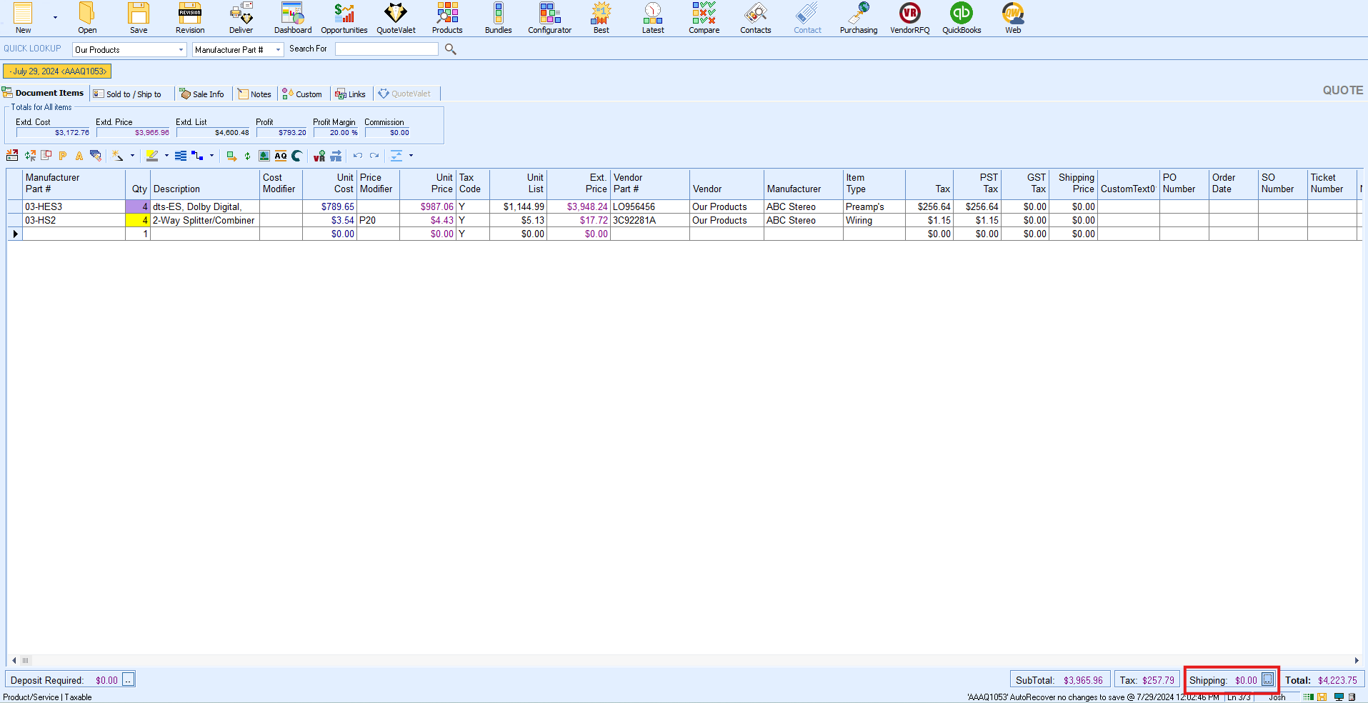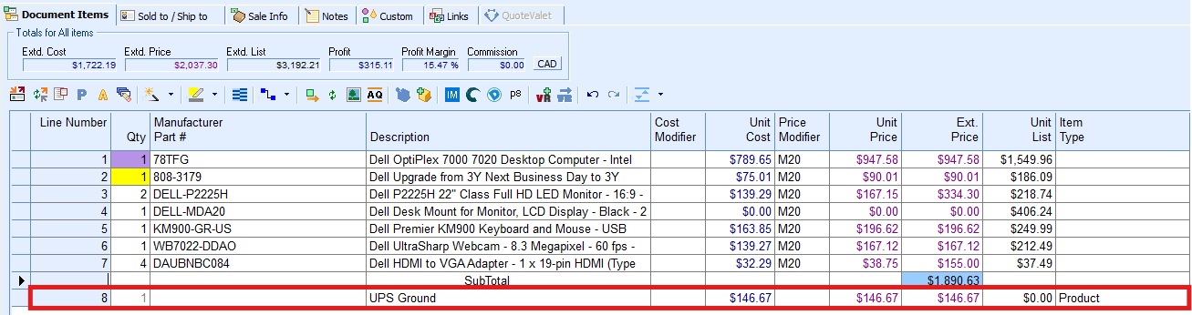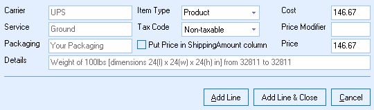 5. Clicking Add Line or Add Line & Close will add the shipping information as a line item on the quote. The Cost, Price Modifier, and any other selections you have made will be reflected on the newly created line item. This item will be included on printed outputs including when delivered via QuoteValet.