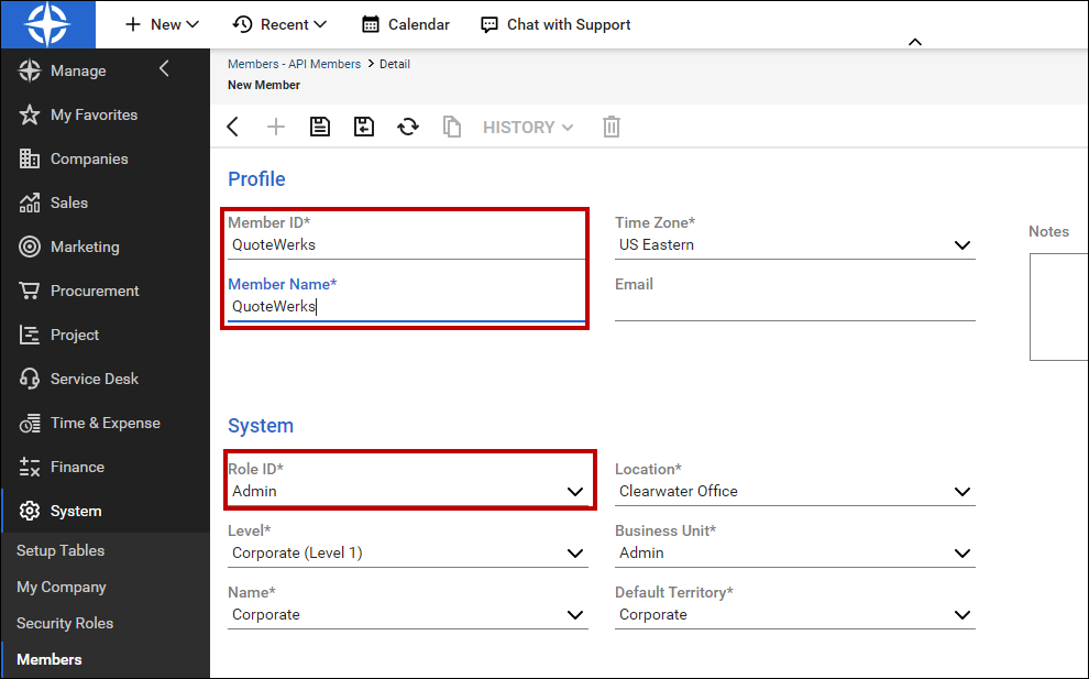 3.For the Member ID and Member name, type in "QuoteWerks" without the quotations and set the Role ID to "Admin". Fill out the other required fields. Click the Save button when finished.