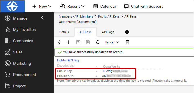 6.Once you have saved the Public and Private keys in a document, these keys need to be added to QuoteWerks. To complete the setup, view the Configuring QuoteWerks for use with ConnectWise topic.