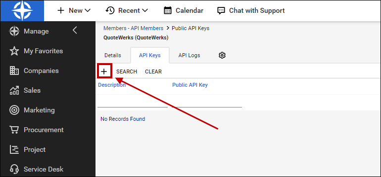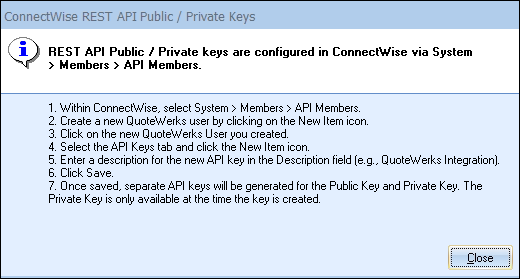 QuoteWerks uses the official ConnectWise partner API for our integration, which requires minimal setup in ConnectWise. This setup creates a Public and Private key required to use the integration between QuoteWerks and ConnectWise. Before you can specify these credentials in QuoteWerks, you need to create them in ConnectWise.
