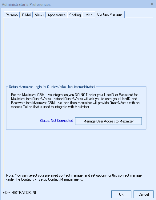 QuoteWerks needs each user's Maximizer login ID and password to log into and integrate with Maximizer CRM Live. These credentials can be specified for the currently logged in user on the Contact Manager Tab of the user’s Tools -> My Preferences menu.