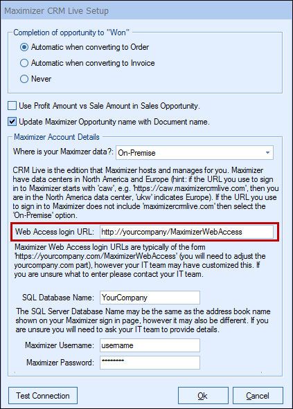 In this field add your login URL. It should similar to https://yourcompany/MaximizerWebAccess, but can be different. Consult your IT team if you are unsure of the URL.