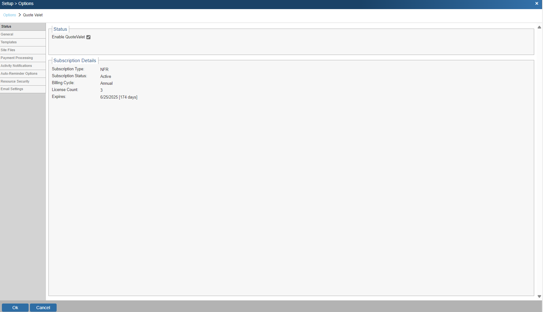 The QuoteValet setup is located in the Setup -> Options menu, under QuoteValet.
