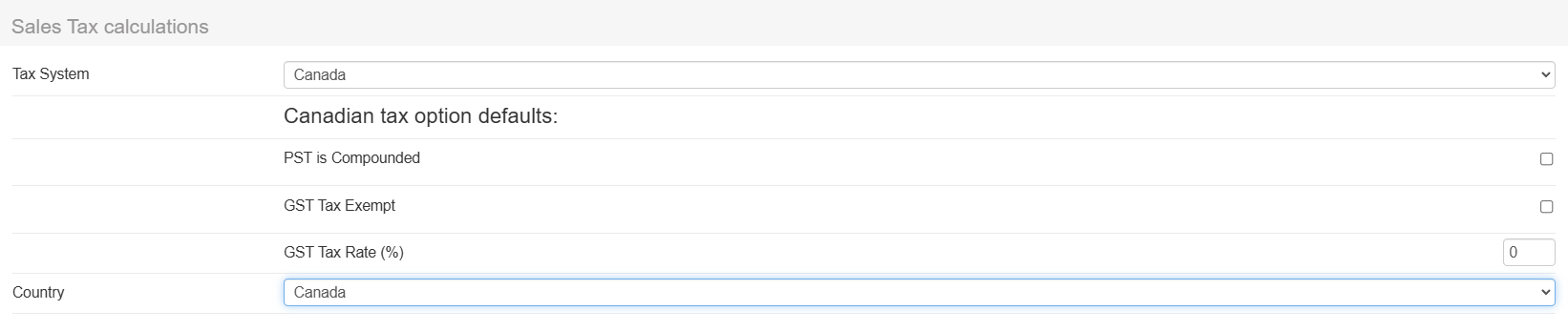 In the Base sales tax calculations on country area of the window select "Canada" from the drop-down box next to tax system and "Canada" from the drop-down box under country.