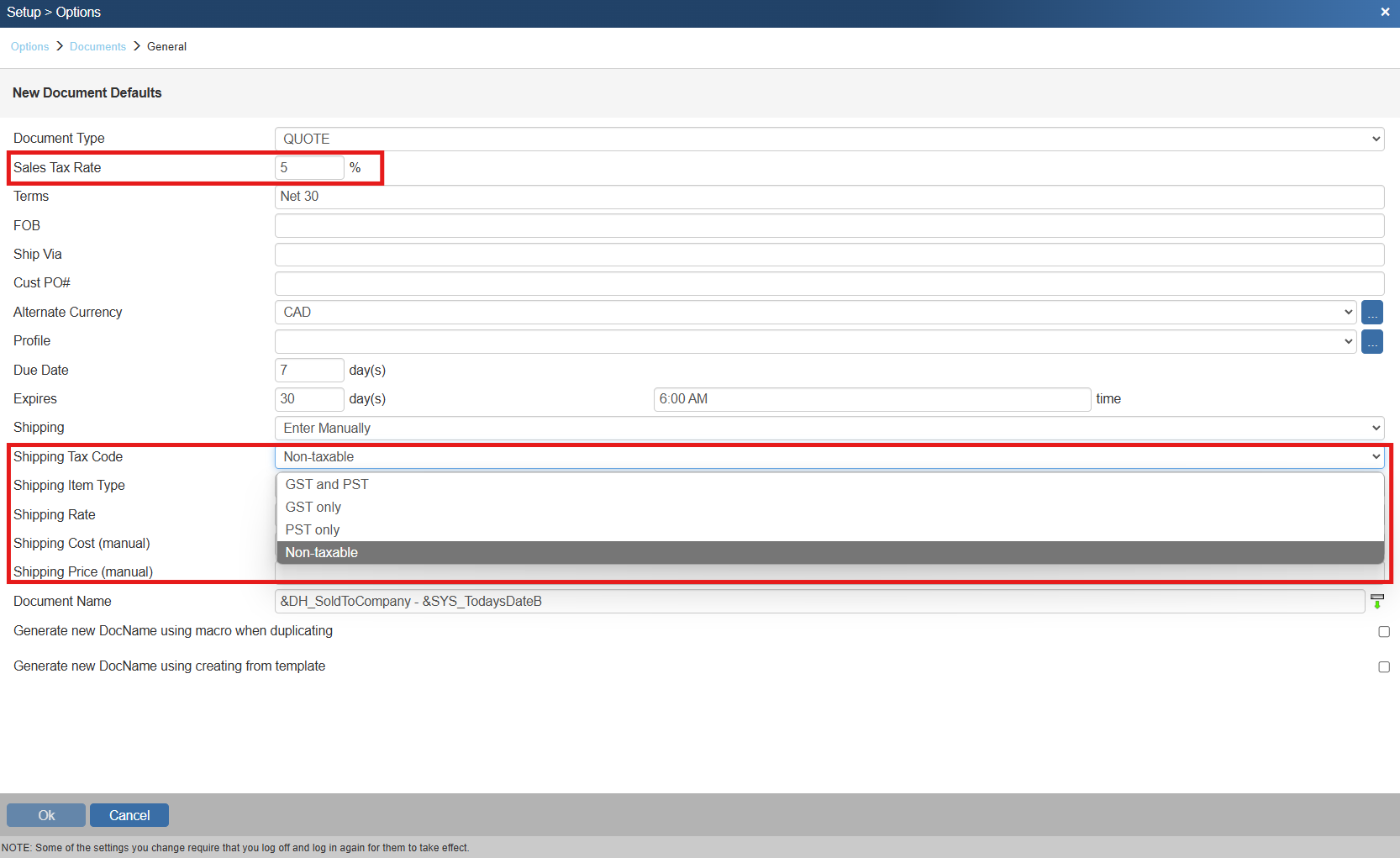 On the Documents tab, you can set the default PST tax rate for all new quotes in the Sales Tax Rate field. This will be the default rate for new quotes, orders, and invoices.
