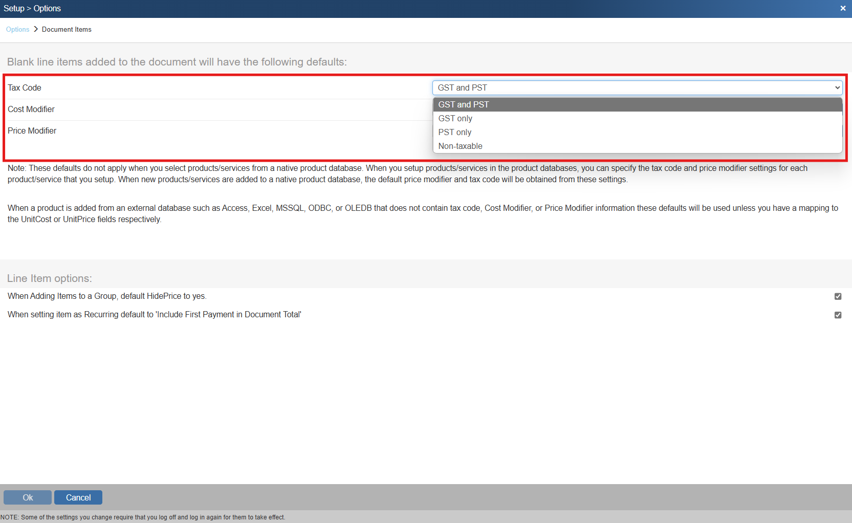 Note: These defaults can all be changed manually on a quote-by-quote basis on the Sale Info tab of the Quote Workbook. Also, you can choose the View -> Customize Columns menu to include the PST tax and GST tax columns for each line item in the quote on the Document Items tab. |