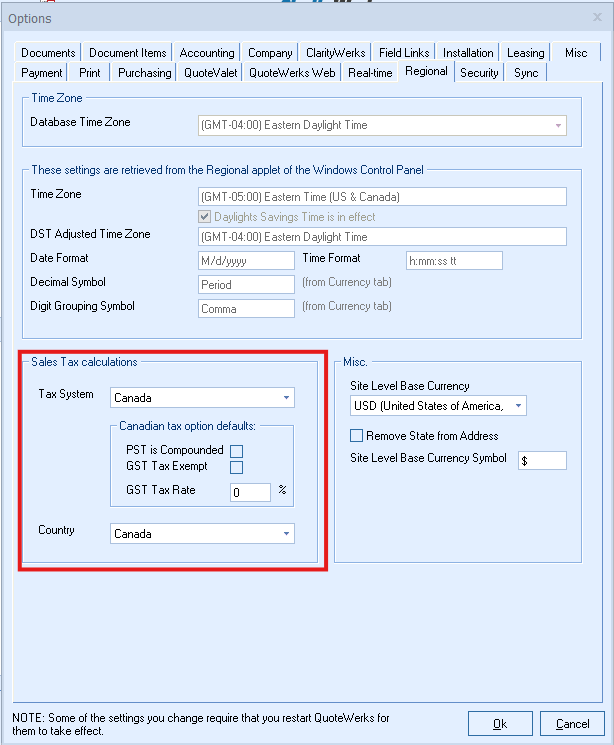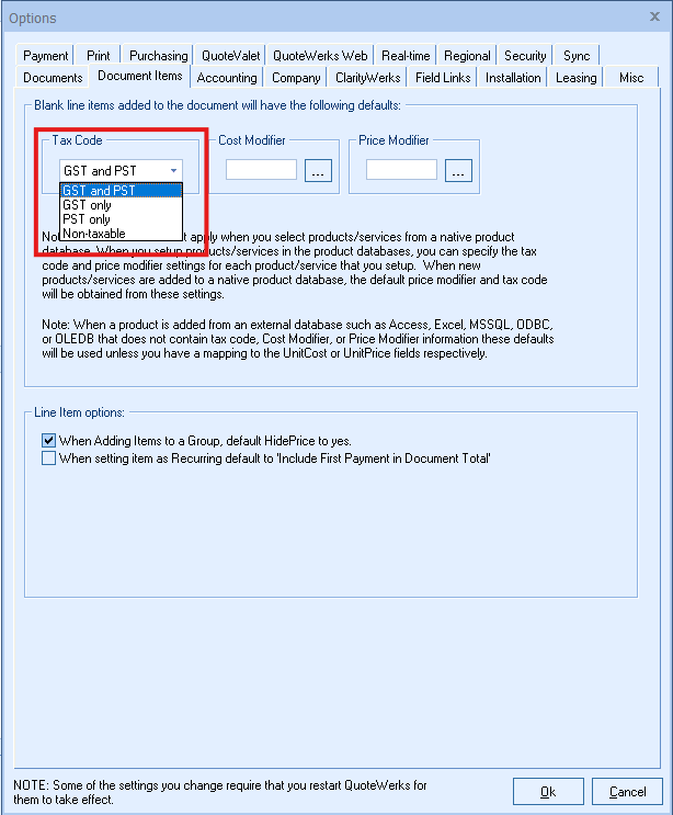 Note: These defaults can all be changed manually on a quote-by-quote basis on the Sale Info tab of the Quote Workbook. Also, you can choose the View -> Customize Columns menu to include the PST tax and GST tax columns for each line item in the quote on the Document Items tab. |