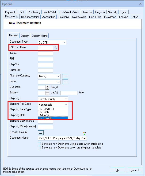 On the Documents tab, you can set the default PST tax rate for all new quotes in the PST Tax Rate field. This will be the default rate for new quotes, orders, and invoices.