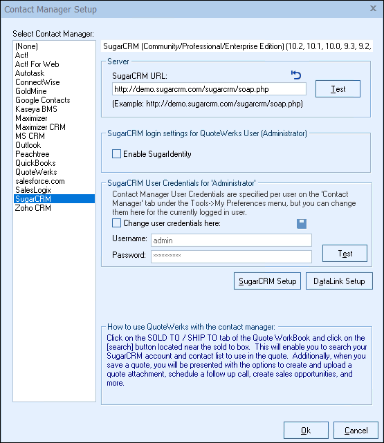 QuoteWerks needs your SugarCRM login ID and password to log into and integrate with SugarCRM. These credentials can be specified for the currently logged in user on this setup window as shown above, OR the Contact Manager Tab of the user’s Tools -> My Preferences menu.