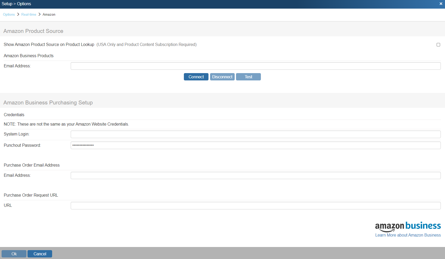 11. In QuoteWerks navigate to the Real-time Setup window by selecting Setup -> Options -> Real-time-> Amazon. Paste the System Login, Password and the Purchase Order Request URL. Make sure you copy the Purchase Order Request URL NOT the Punchout URL into QuoteWerks.