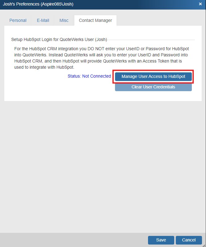 1. As a prerequisite you must Setup the HubSpot Login for QuoteWerks User by Navigating to Setup > My Preferences > Contact Manager. Once on this page you will click on "Manage User Access to HubSpot."
