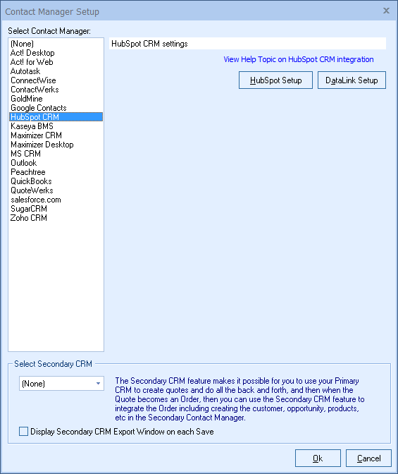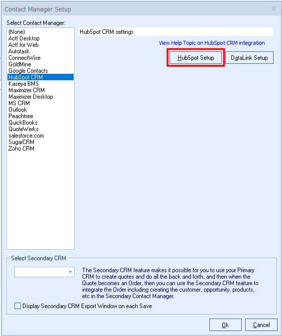 Step 3: Select HubSpot CRM as your contact manager on the left side of the Contact Manager Setup window and select OK.