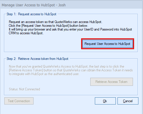 Step 6: Click on the [Request User Access to HubSpot] button. This will open a browser and as that you enter your UserID and Password into HubSpot CRM to access HubSpot.