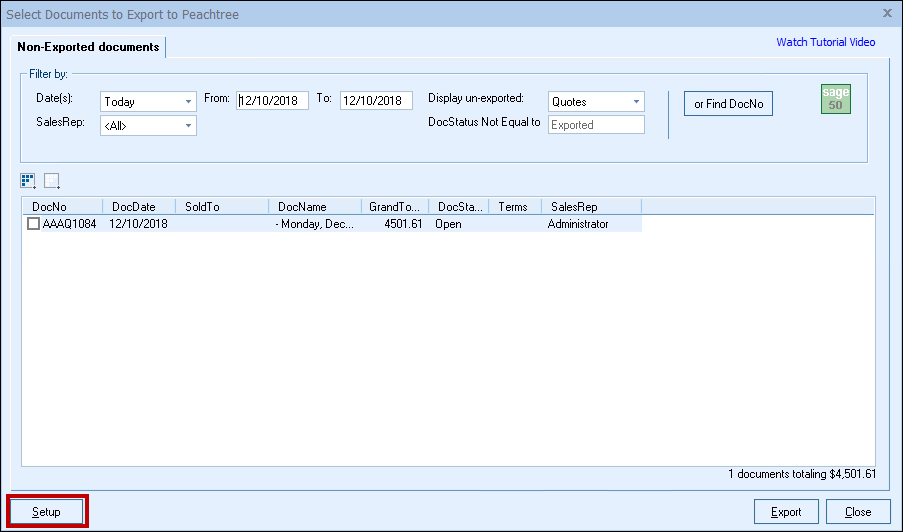 •Tools -> Export to Peachtree menu, then clicking on the [Setup] button.