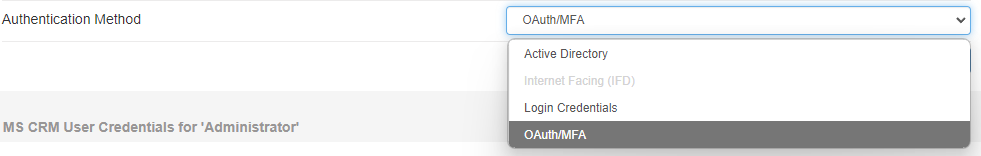 Important:   If you are using MS CRM 9.0 or higher, you must select the OAuth/MFA option, regardless of internal setup, otherwise the integration will not work.