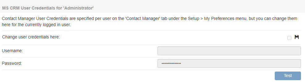 In this frame, you can override these user credentials (if needed) for testing purposes. This way you can test different logins directly from this window. You can also click on the Save icon to save the login credentials entered here, updating the credentials on the Contact Manager tab for the currently logged in user.