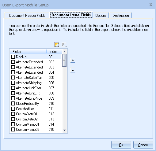 On the Document Items Fields tab choose the Document Items Fields tab to specify which of the DocumentItems fields you would like to export to the text file, and in what order. Place a checkmark next to each field you would like to export. To specify the order in which the fields are exported, select a field, and use the up and down arrow buttons to re-position it.