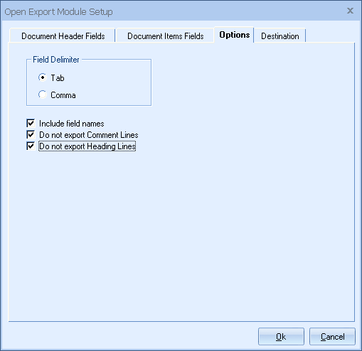 This option lets you choose how to separate the field data in the export file. You can choose tab or comma delimiters.