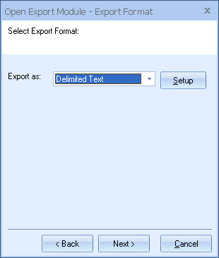 To get into the setup for the delimited text export, you need to click on the [Next] button to move past the first step. The second step is “Select Export Format”: