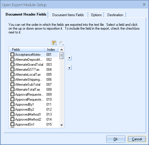 On the Open Export Module Setup window, choose the Document Header Fields tab to specify which of the DocumentHeader fields you would like to export to the text file, and in what order. Place a checkmark next to each field you would like to export. To specify the order in which the fields are exported, select a field, and use the up and down arrow buttons to re-position it.