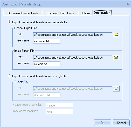 On the Destination tab you can specify options for the text file that will be created. Quote data can be separated into two areas – the header and the items. The header data includes the contact information, address, terms, etc. The item data includes all the line items in the quote.