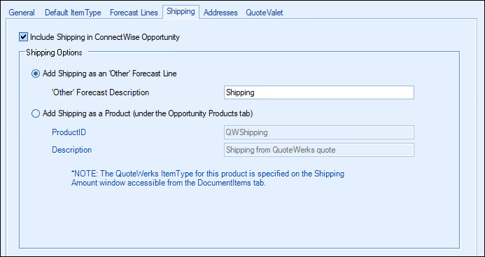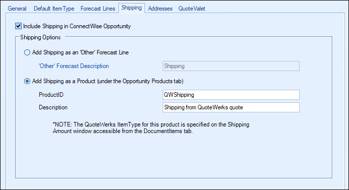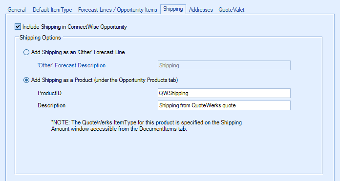 The second option enables users to add the shipping as a product under the opportunity in the Products Tab. When choosing this option you will need to choose a name for the shipping “product” when it is sent to ConnectWise. The default will be QWShipping if you choose not to change it. Because the shipping line item is added to the ConnectWise product database as well as to the Products tab of the Opportunity, it must have a manufacturer part number specified since it is viewed as a product.
