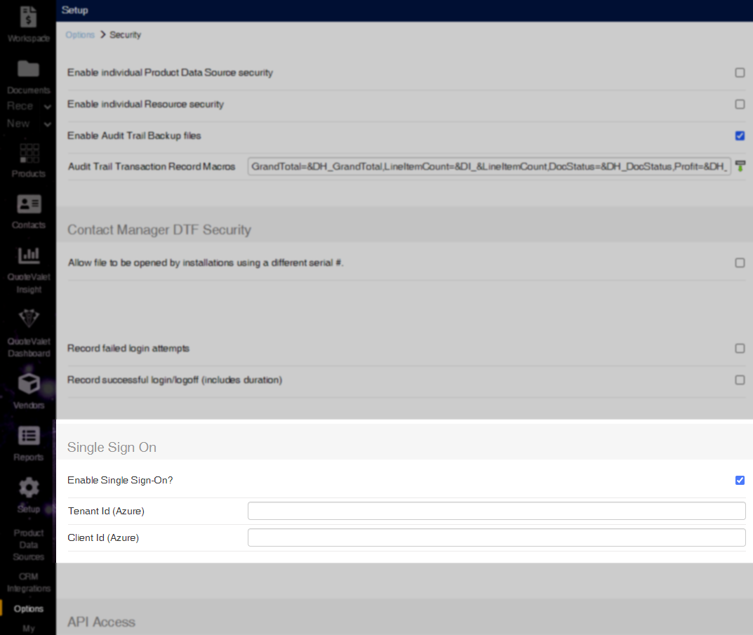 10. In QuoteWerks Web, navigate to Options --> Security -->Single Sign On. Check the box to Enable Single Sign On, and then paste your Tenant ID and Client ID from the previous step into the appropriate fields.