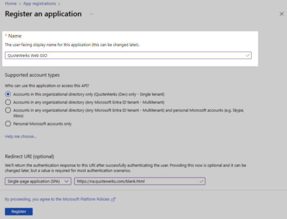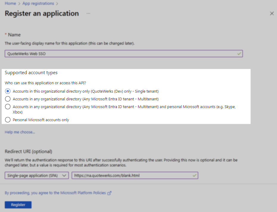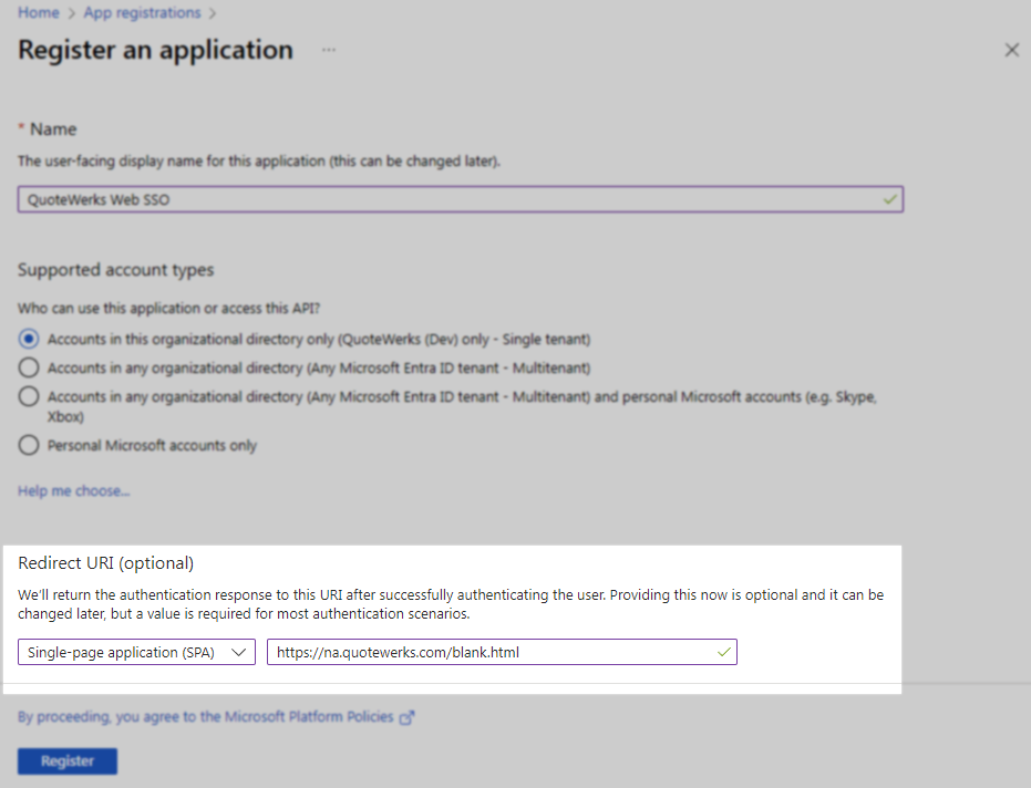 7. Under Redirect URI (optional) set the scope to Single-page application and the address to https://na.quotewerks.com/blank.html