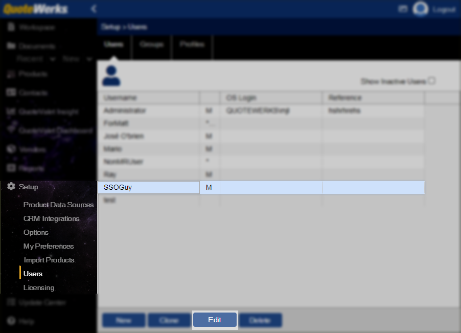 4. Switch to QuoteWerks Web and navigate to Setup --> Users --> Select the user you wish to enable SSO for and click Edit or double-click the Username
