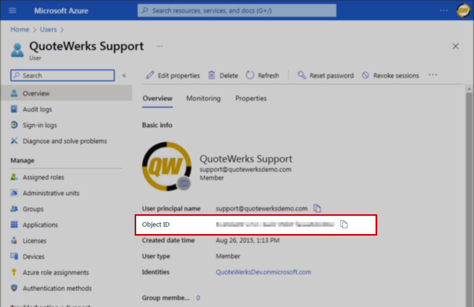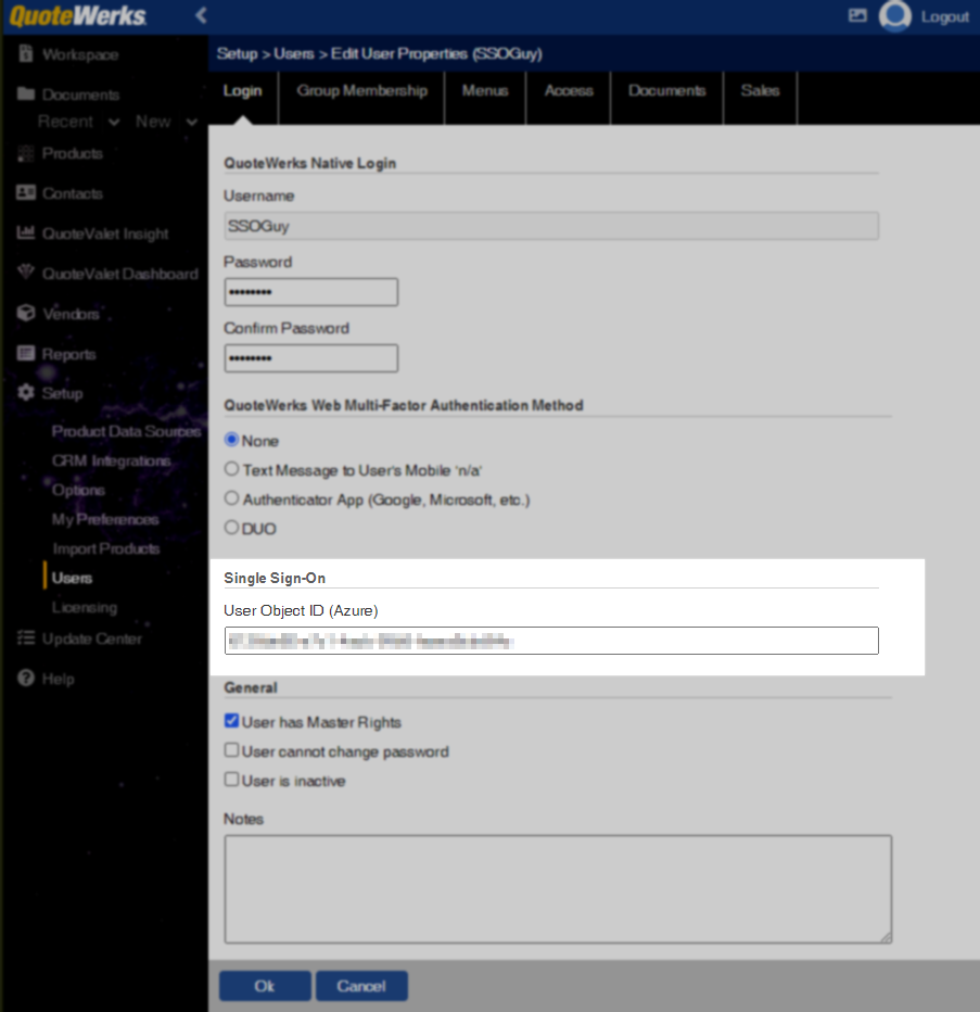 To allow users to use SSO, you will need to add their Object ID from Microsoft to their Login. If you do not add the information to the user’s setting, they can still log in using a QuoteWerks Username & Password.