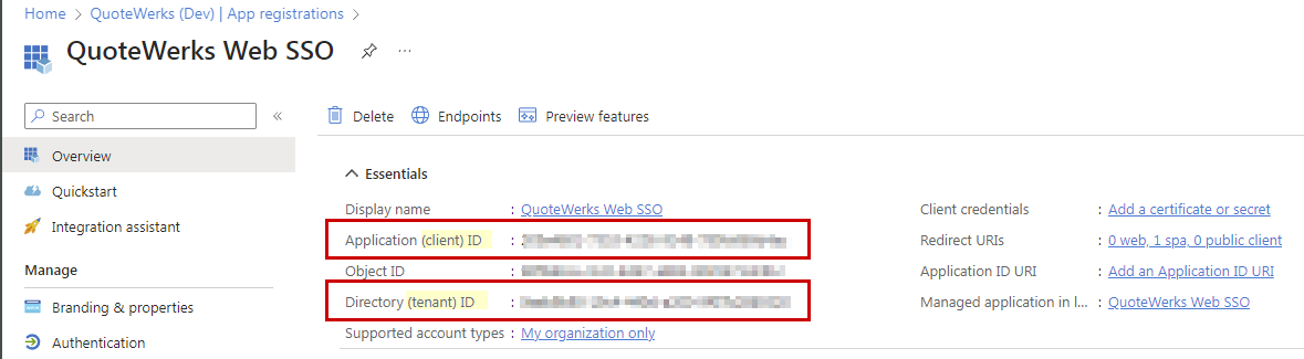 9. Right below the Display name, you will see the Application (client) ID and Directory (tenant) ID. Copy these strings into a notepad for pasting them into the QuoteWerks Web SSO Configuration page