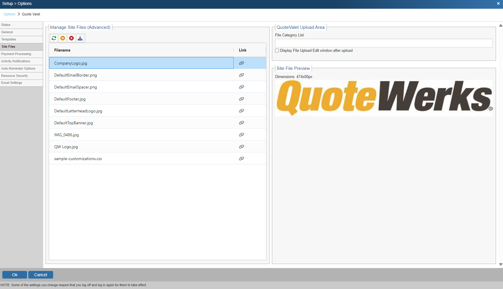 Only the follow file types can be uploaded to the QuoteValet Tenant Site: .GIF, .ICO, .JPG, .JPEG, .PNG, .CSS, .JS, .PDF