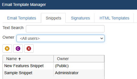 To create a new Snippet, first choose the “Snippets” tab from the Tools-> Customize Email Templates menu option. Choose which user you would like to create the new Snippet for under the “Owner” drop down menu and then click on the