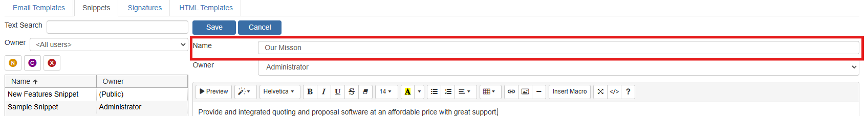 You are able to change the owner by selecting the drop down menu below of the Snippet name. You will also now be able to save the Snippet and any changes by clicking on the save.