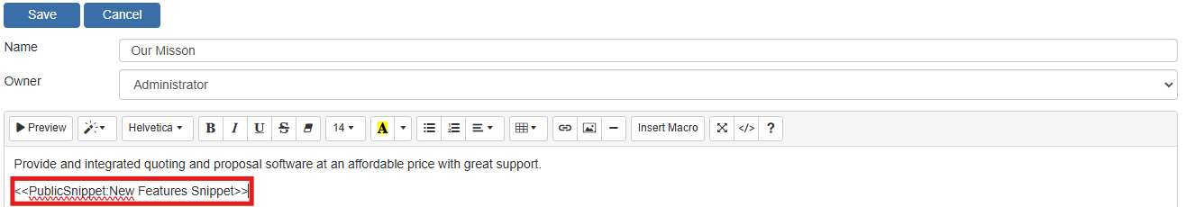 Once the snippet macro has been added to the email template you will need to enter in the snippet name. The macro should look like this: