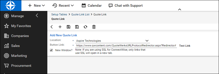 Step 5: In the Button Link field, enter the following URL: https://www.qwcontent.com/QuoteWerksURLProtocolRedirector.aspx?RedirectorAction=quotebutton&source=ConnectWise&SoldToCMOpportunityRecID={recid}