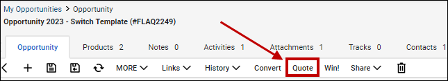 The Quote Link button enables users to launch a QuoteWerks quote for the specific opportunity in ConnectWise. To use this feature, click on the “Quote” button on the top of the opportunity: