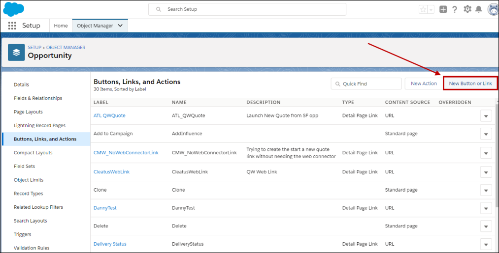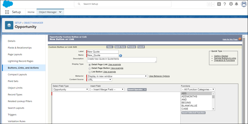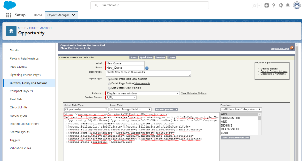 Before you can initiate the creation of a new quote by clicking on a hyperlink on the opportunity tab in salesforce.com, you will need to setup the hyperlink. This web integration link will launch QuoteWerks and pass it the necessary information from your opportunity.