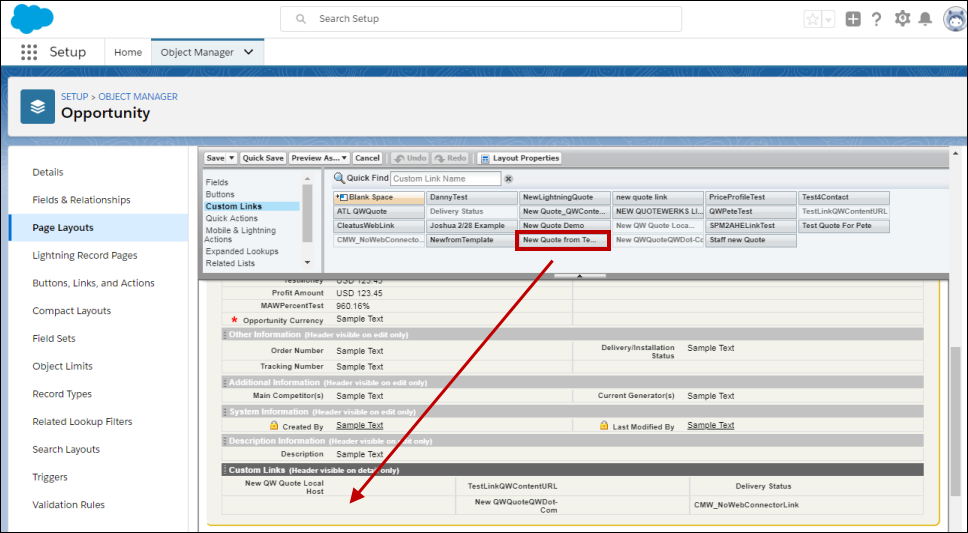 Step 10: To add the “New Quote” web integration link to the page layout, edit the Opportunity Layout (sales). To add this web integration link to the page layout, drag it into the Custom Links section: