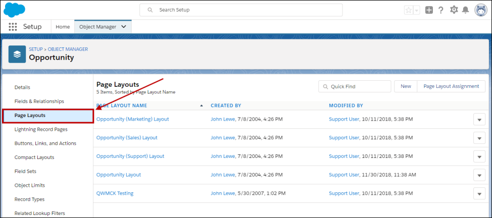 Step 9: Click on the “Page Layouts” link under the Setup-> Object Manager-> Opportunity Menu: