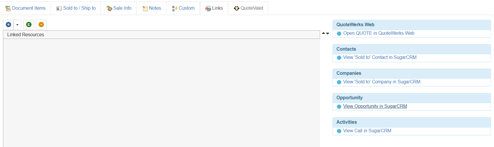 The Auto-Links window creates dynamically generated links from SugarCRM and links to specific details from the QuoteWerks quote. These links are automatically created.