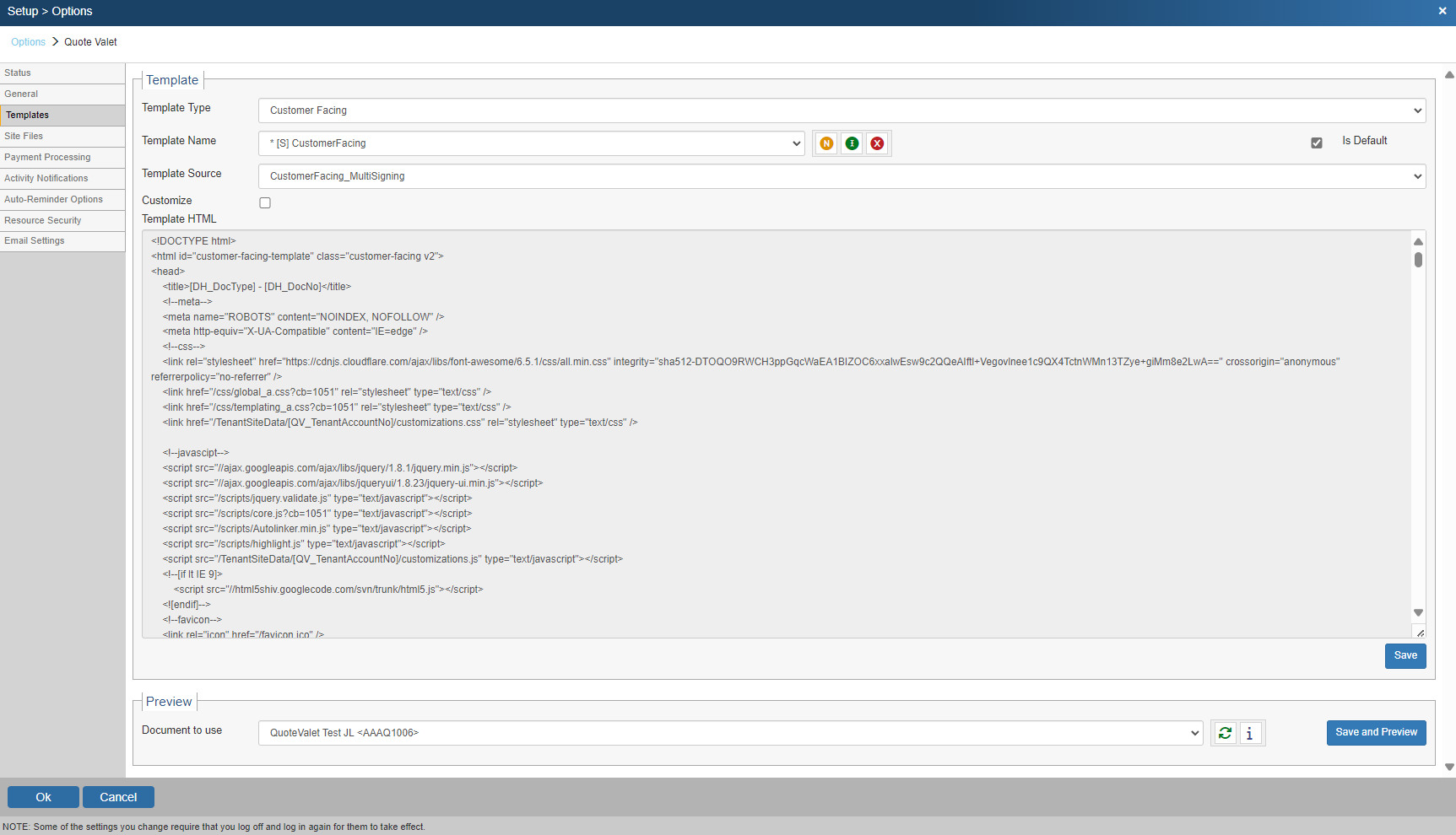 If you have your own developers on staff, you can make modifications on your own. To access the HTML to do this, go to Tools -> Options menu > QuoteValet tab, then click on the [Setup] button. This will bring you to the Templates tab, as discussed above.