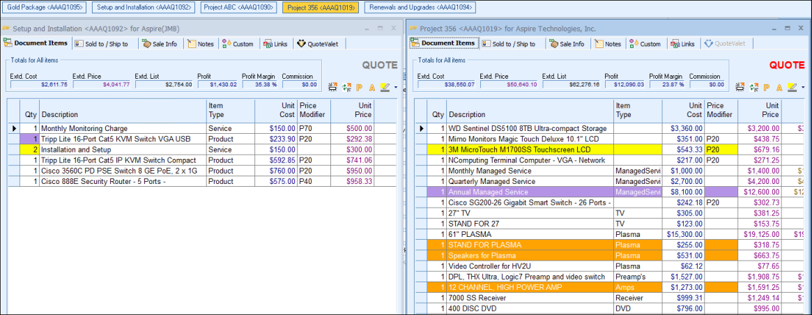 You can switch between the documents by clicking on the document name or using the keyboard shortcut of [CTRL+TAB]. Additionally, holding the [CTRL] key while clicking on a 2nd document will automatically line up two documents together in the same window to make it easier to compare the documents, copy and paste, etc. Holding down [CTRL+SHIFT] and clicking on the 2nd document will maximize both documents in QuoteWerks.