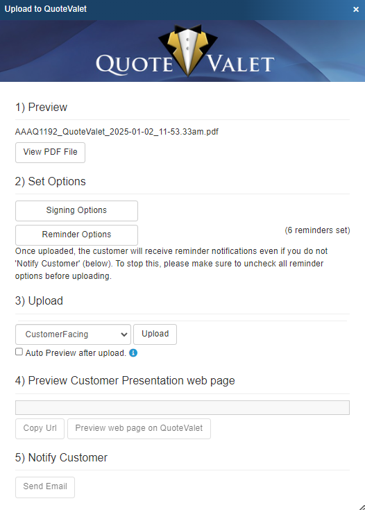 The Auto Preview after upload checkbox will automatically launch the quote in preview mode when your upload completes to the QuoteValet server.