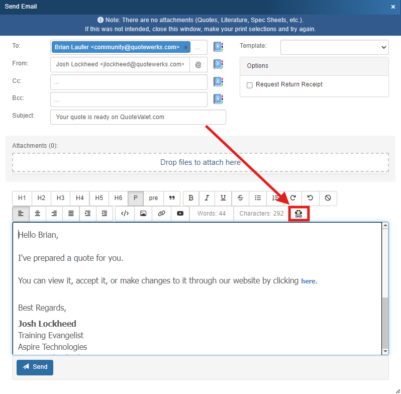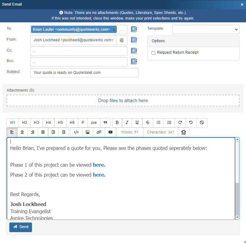When emailing a customer the link to their quote, you may have created multiple quotes as options or different phases of a project. You can insert other QuoteValet links into a single email by using the [Copy QuoteValet Customer Facing URL] button on the Send Email window.