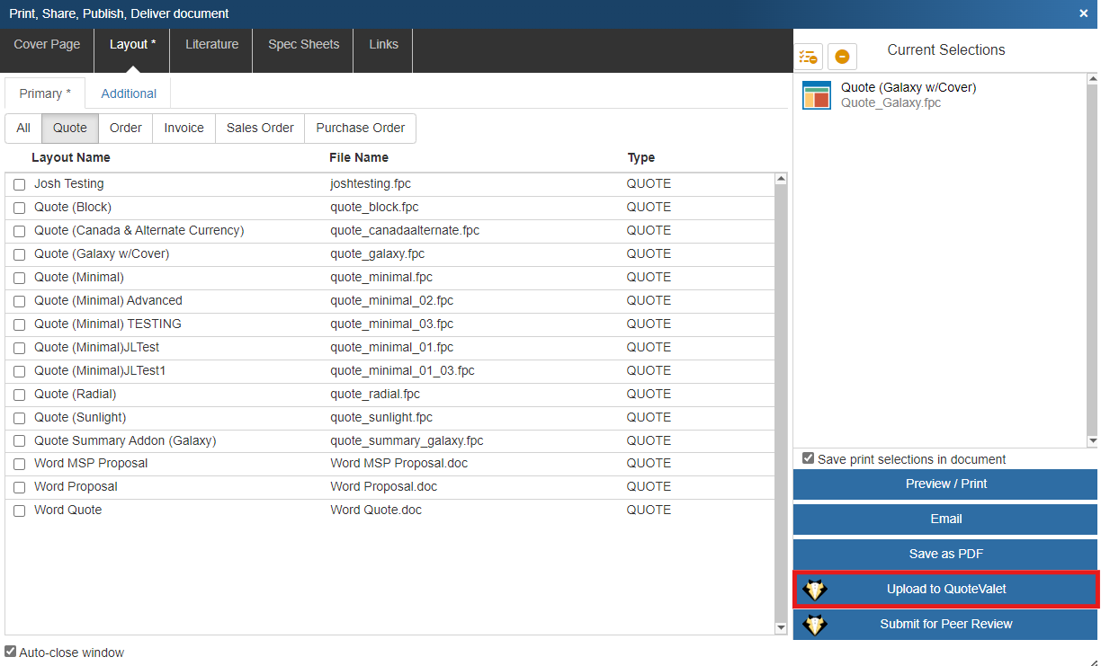 Upload Quote to QuoteValet Window
